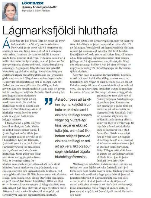 Bjarney Anna Bjarnadóttir, lögmaður og einn af eigendum BBA//Fjeldco skrifar reglulega greinar í Viðskiptamoggann. Að þessu sinni fjallar hún um það formskilyrði hlutafélagalaga að hluthafar þurfi að lágmarkiað vera tveir.
